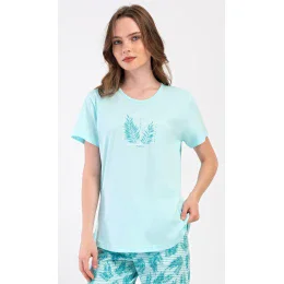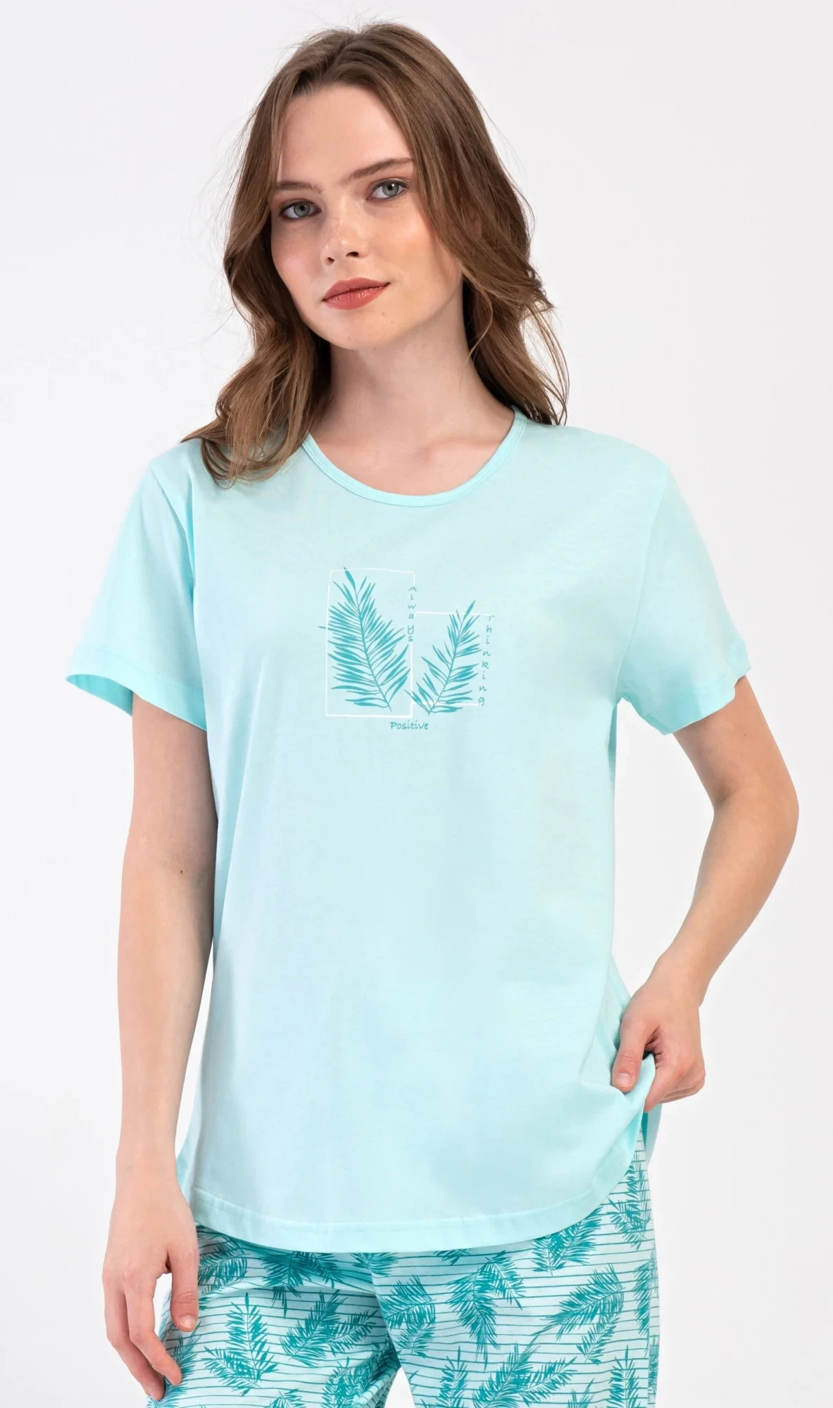 Dámské bavlněné kapri pyžamo Simona. Dámské pyžamo se skládá z trička s krátkým rukávem a tříčtvrtečních kalhot. Tričko s kulatým výstřihem má na hrudi obrázek větvičky a drobný nápis. Motiv větviček se opakuje i na kalhotách, které mají v pase gumu a šňůrku na stažení, jsou bez kapes. Použitý bavlněný materiál je příjemný a poddajný na dotek.