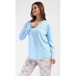 Dámské bavlněné dlouhé pyžamo Alex. Dámské pyžamo se skládá z trika s dlouhým rukávem a dlouhých kalhot. Triko je jednobarevné, zdobené na hrudi drobným obrázkem listu. Motiv listů se opakuje i na kalhotách, které mají v pase gumu a šňůrku na stažení, nemají kapsy. Použitý bavlněný materiál je poddajný a příjemný na dotek.