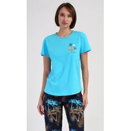 Dámské bavlněné kapri pyžamo Tropicana. Dámské pyžamo se skládá z trička s krátkým rukávem a tříčtvrtečních kalhot. Tričko s kulatým výstřihem má na hrudi obrázek tropické palmy. Tento motiv se opakuje i na kalhotách, které mají v pase gumu a šňůrku na stažení, jsou bez kapes. Použitý bavlněný materiál je příjemný a poddajný na dotek.