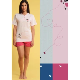 Dámské pyžamo od italské značky Karelpiu ze 100% bavlny. Pyžamo se skládá ze dvou dílů, trička a kraťasů. Vrchní díl s krátkým rukávem má kulatý dekolt a légu na zapínání se 3 knoflíky. Na přední straně má velesý potisk koček. Spodní díl má potisk malých srdíček. Díky 100% bavlně se v něm budete cítit velmi příjemně.