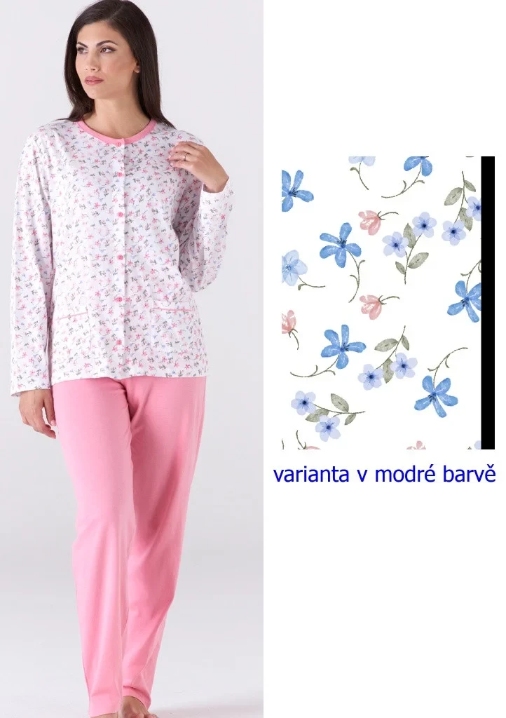 Dámské pyžamo italské značky Karelpiu. Pyžamo se skládá z trička a kalhot. Tričko má dlouhý rukáv, kulatý výstřih s légou a knoflíky po celé délce - dá se rozepnout. Tričko je s květinovým celopotiskem. Ve spodní části na bocích jsou našity kapsičky. Kalhoty jsou dlouhé, jednobarevné, bez kapes. V pase je obšitá pohodlná pružná guma. Pyžamo je ušito z lehké příjemné bavlny. Pyžamo je dostupné ve dvou barevných variantách.