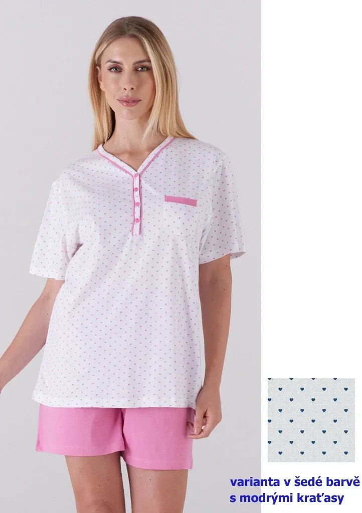 Dámské pyžamo italské značky Karelpiu. Pyžamo se skládá ze dvou dílů. Tričko má krátký rukáv, výstřih je mírně do "V" a dále pokračuje léga s třemi knoflíky. Na levé straně je našitá malá kapsička. Po celé ploše je drobný potisk srdíček. Kraťasy jsou jednobarevné, v pase jsou ušité do pohodlné pružné gumy. Pyžamo je ušité z lehké příjemné bavlny, ideální na letní dny. Pyžamo je ve dvou barevných variantách.