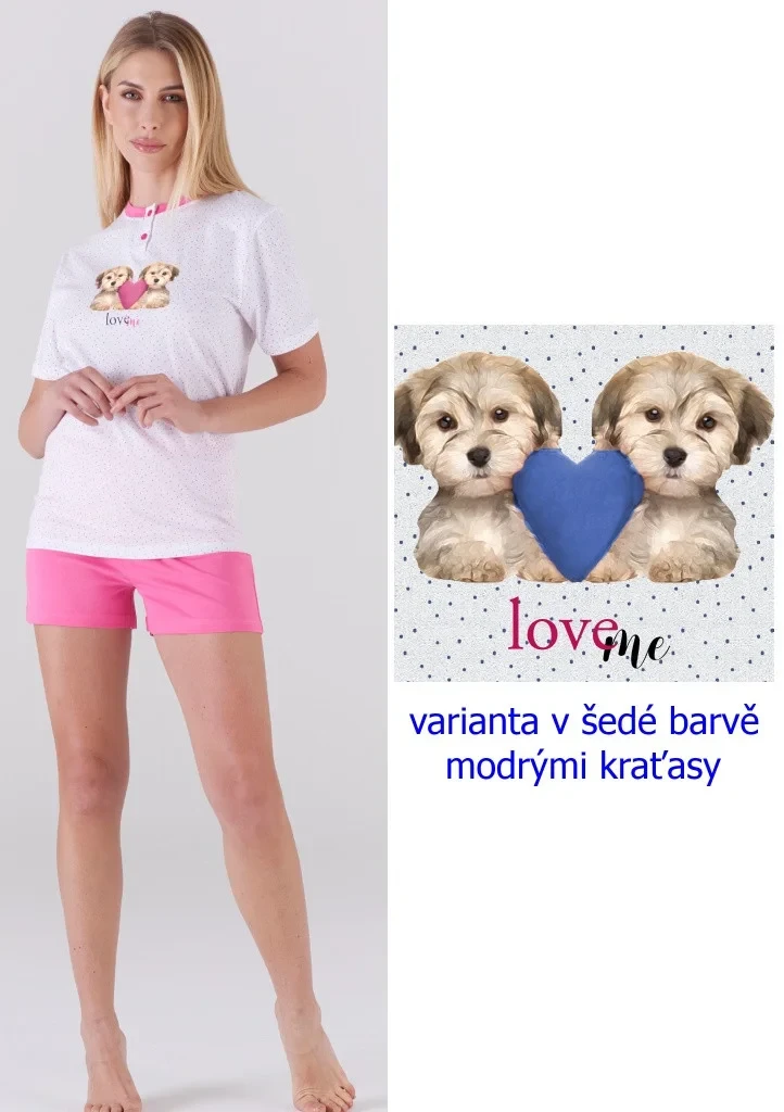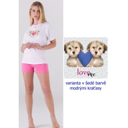 Dámské letní pyžamo italské značky Karelpiu. Pyžamo je dvoudílné. Tričko má krátký rukáv, kulatý výstřih s légou a dvěma knoflíky. Tričko je puntíkované s potiskem uprostřed. Šortky jsou jednobarevné, bez kapes, v pase jsou ušité do pohodlné pružné gumy. Pyžamo je ušité z lehké příjemné bavlny, ideální na letní dny. Pyžamo je ve dvou barevných variantách.