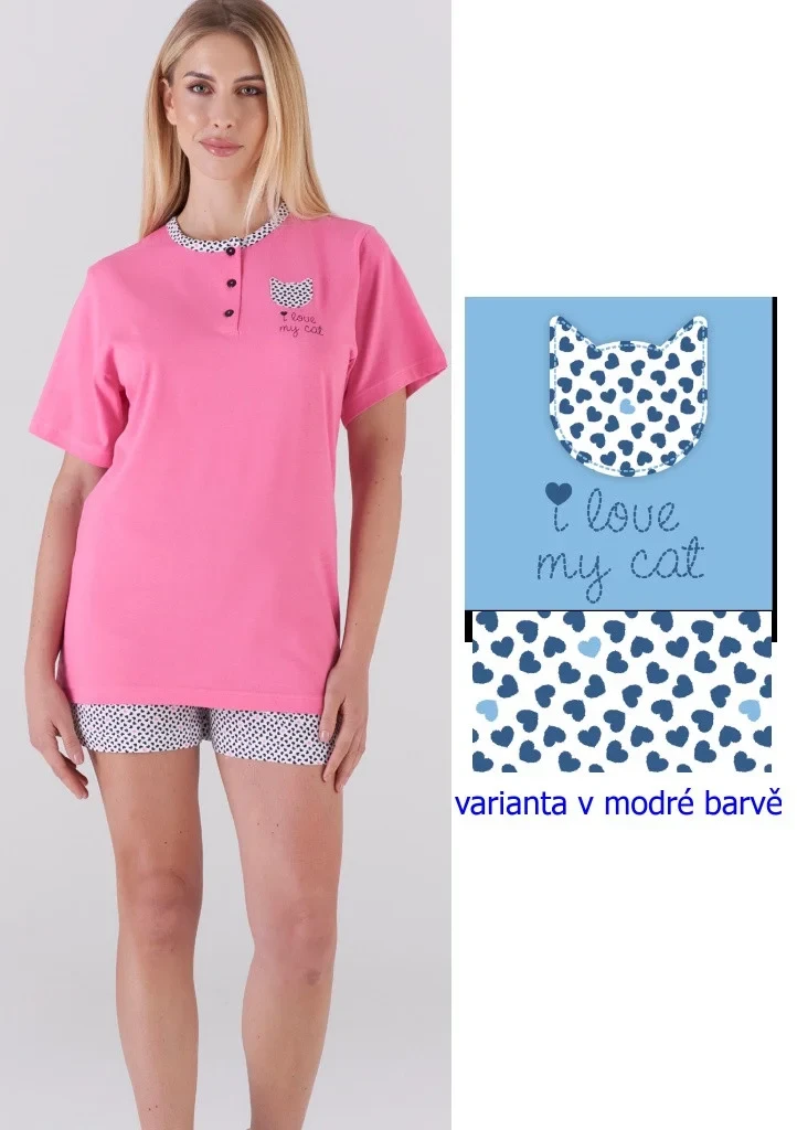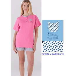 Dámské letní pyžamo italské značky Karelpiu. Pyžamo je dvoudílné. Tričko má krátký rukáv, kulatý výstřih s légou a třemi knoflíky. Tričko je jednobarevné na pravé straně je našitý obrys kočičí hlavy, pod ní je natištěný nápis. Šortky jsou po celé ploše potištěny srdíčky, nemají kapsy, v pase je všita pohodlná pružná guma. Pyžamo je ušité z lehké příjemné bavlny, ideální na letní dny. Pyžamo je ve dvou barevných variantách.
