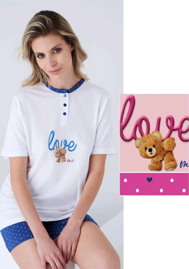 Dámské pyžamo značky KarelPiu v jemném a hravém designu, které spojuje pohodlí a ženský styl. Tričko s krátkým rukávem je vyrobené z příjemného, měkkého materiálu a zdobené roztomilým motivem medvídka s nápisem „love me“. Kulatý výstřih s drobnými knoflíčky dodává modelu elegantní detail. Krátké kalhoty s drobným vzorem perfektně ladí s horním dílem a zajišťují komfort při spánku i domácím odpočinku. Pyžamo je ideální volbou pro teplejší noci a potěší všechny, které mají rády pohodlné, ale zároveň hezké noční prádlo. Dostupné v bílo-modré a světle růžové variantě.