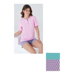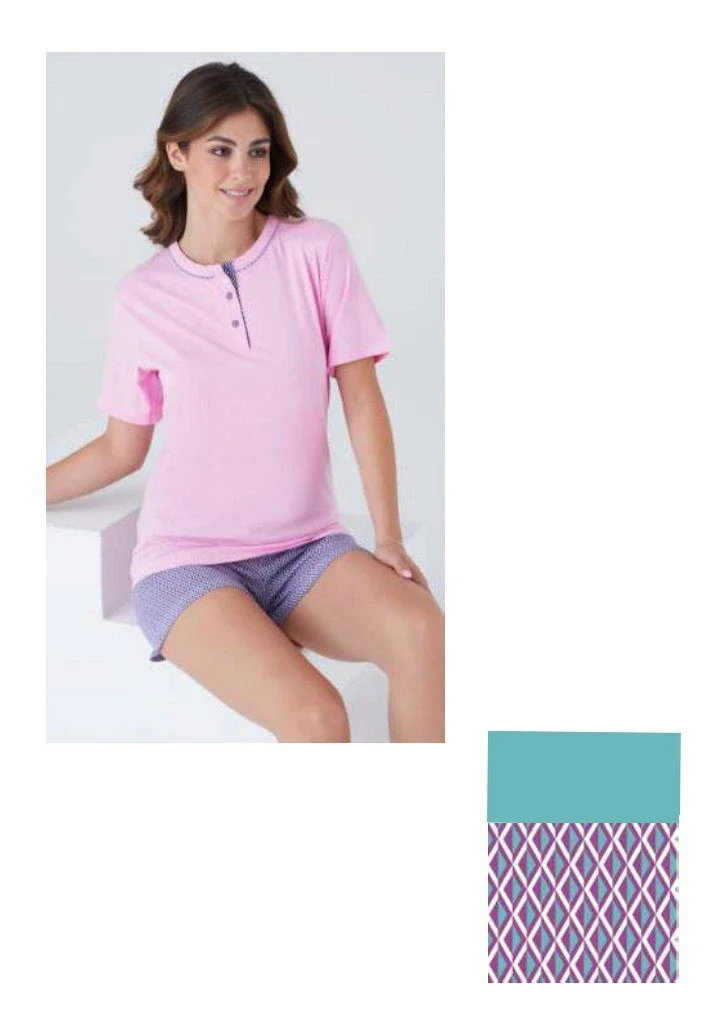 Dámské letní pyžamo italské značky Karelpiu. Pyžamo je dvoudílné. Tričko má krátký rukáv, kulatý výstřih s légou se třemi knoflíky. Tričko je jednobarevné s ozdobným lemem okolo krku. Šortky jsou po celé ploše potištěny, nemají kapsy, v pase je všita pohodlná pružná guma. Pyžamo je ušité z lehké příjemné bavlny, ideální na letní dny. Pyžamo je ve dvou barevných variantách.