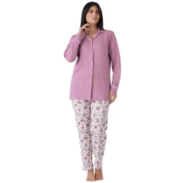Dámské bavlněné pyžamo značky Karelpiu. Pyžamo se skládá z kabátku s dlouhým rukávem, okolo krku má klopy a je celopropínací na knoflíky. Rukávy jsou ukončené volně. Na bocích kabátku jsou našité kapsy. Kalhoty jsou v pase do pružné obšité gumy. Pyžamo je ušité z příjemné hřejivé bavlny.