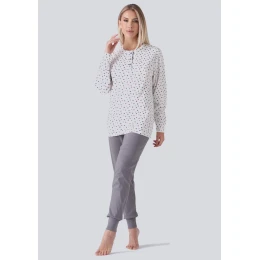 Dámské bavlněné pyžamo značky Karelpiu. Pyžamo se skládá z trička s dlouhým rukávem, okolo krku je kulatý výstřih a léga se třemi knoflíky. Rukávy jsou ukončené do lemu ze stejného materiálu, jako je tričko. Kalhoty jsou v pase do pružné obšité gumy. Pyžamo je ušité z příjemné hřejivé bavlny.