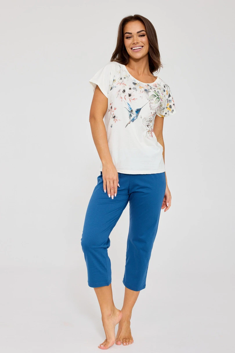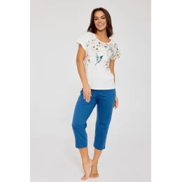 Souprava se skládá z trička s krátkým rukávem a kulatým výstřihem, jehož přední stranu zdobí jemný květinový potisk, který dodává decentní eleganci, doplněného pevnými kalhotami v délce 7/8, které zaručují pohodlí a lehkost nošení. Díky přírodnímu materiálu je pyžamo ideální pro všechna roční období.