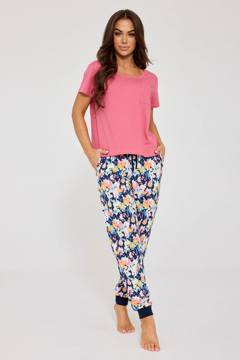 Dámské pyžamo KR 730/337 POLA je výjimečně pohodlný noční komplet ze 100% přírodní bavlny. Model kombinuje klasické hladké tričko s poutavými květinovými kalhotami a vytváří tak stylový a pohodlný komplet ideální pro každé roční období. Tričko s krátkým rukávem a kulatým výstřihem zajišťuje volnost pohybu, zatímco našitá náprsní kapsa dodává jemný půvab. Dlouhé kalhoty s barevným květinovým potiskem mají praktické kapsy na bocích, žebrované nohavice a zavazovací pásek, který zaručuje dokonalé padnutí. Pyžamo je zabaleno v estetické krabičce - ideální také jako dárek.