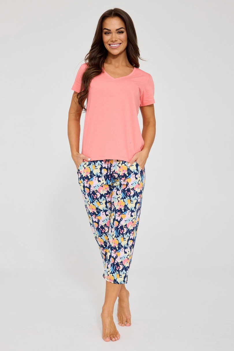 Halenka s krátkými rukávy byla navržena s ženským výstřihem do V, který jemně zvýrazňuje siluetu a odlehčuje celý vzhled. Součástí kompletu jsou vzorované kalhoty v délce 7/8 s praktickými kapsami na bocích. Elastický pas lemovaný bavlnou zaručuje dokonalé přizpůsobení bez otlaků. Je ideální volbou jak na večerní procházku, tak na klidná rána doma.