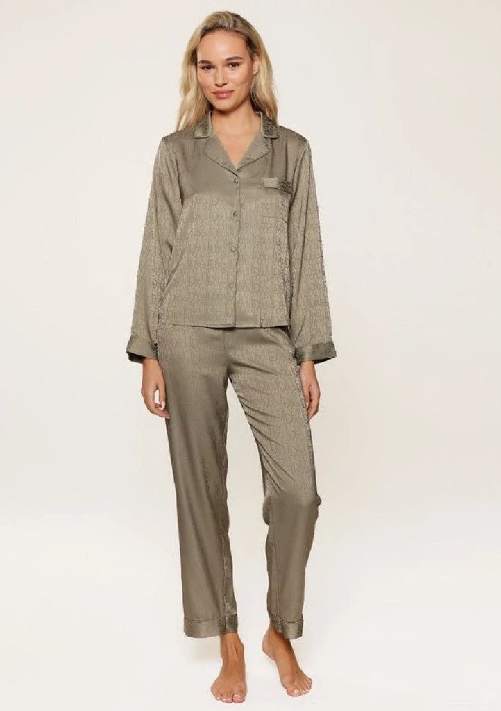 Dámská luxusní pyžamová sada složená z dlouhých kalhot a halenky s dlouhým rukávem, vyrobená z jemného saténového materiálu, který působí hedvábně na dotek a zajišťuje pohodlí při nošení. Halenka má zapínání na knoflíky po celé délce a na přední straně náprsní kapsičku. Kalhoty disponují elastickým pasem pro pohodlné nošení a rovnými nohavicemi pro elegantní vzhled. Po celé ploše pyžama je tištěné logo „LD“ v tónu barvy pyžama.