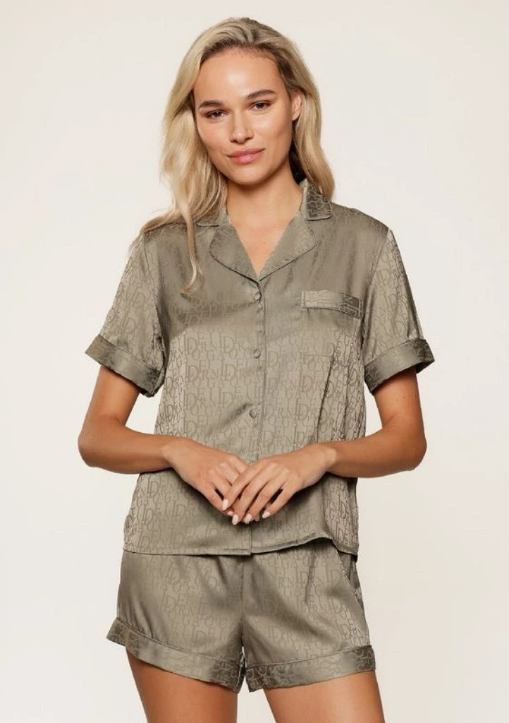 Dámská luxusní pyžamová sada složená z krátkých kalhot a halenky s krátkým rukávem, vyrobená z jemného saténového materiálu, který působí hedvábně na dotek a zajišťuje pohodlí při nošení. Halenka má zapínání na knoflíky po celé délce a na přední straně náprsní kapsičku. Kalhoty disponují elastickým pasem pro pohodlné nošení a rovnými nohavicemi pro elegantní vzhled. Po celé ploše pyžama je tištěné logo „LD“ v tónu barvy pyžama.