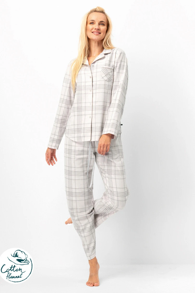 Ta damska piżama flanelowa to doskonałe połączenie komfortu, ciepła i subtelnego stylu. Wykonana z miękkiej, naturalnej bawełny flanelowej, zapewnia przyjemne otulenie i doskonałą izolację cieplną w chłodniejsze wieczory. Góra w formie klasycznej koszuli zapinanej na guziki posiada kołnierzyk oraz kieszonkę na piersi, co nadaje całości eleganckiego charakteru. Spodnie z prostą nogawką i regulowanym pasem na troczki gwarantują wygodne dopasowanie. Delikatny wzór w jasnoszarą kratę sprawia, że zestaw jest uniwersalny i ponadczasowy. Idealny zarówno do spania, jak i na leniwe poranki w domowym zaciszu.