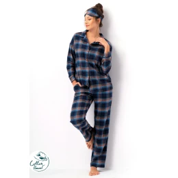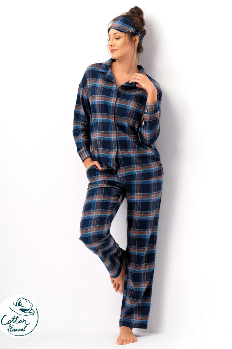 Piżama damska z miękkiej bawełny flanelowej to idealny wybór na zimowe wieczory i poranki. Wzór w elegancką granatowo-brązową kratę nadaje jej klasycznego, ponadczasowego charakteru. Góra w formie koszuli zapinanej na guziki posiada kołnierzyk i kieszonkę na piersi, łącząc wygodę z estetyką. Spodnie o prostym kroju i elastycznym pasie gwarantują swobodę ruchów i komfort podczas snu. W zestawie znajduje się dopasowana opaska na oczy, która pozwala cieszyć się spokojnym, nieprzerwanym snem. To komplet łączący praktyczność, ciepło i kobiecy styl.