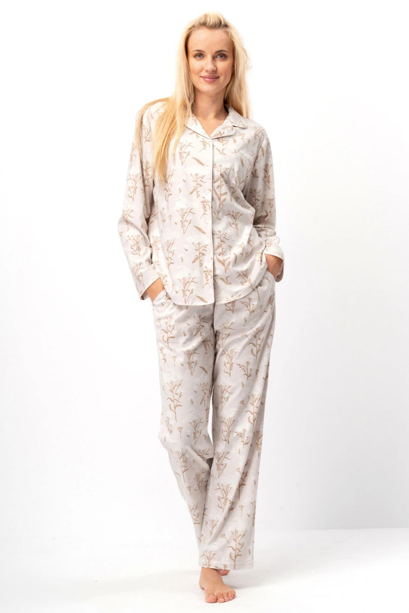 Dámské pyžamo LNS 567 B25 je stylová souprava, která v sobě spojuje pohodlí a eleganci. Je vyrobena z kvalitní, měkké polyesterové tkaniny, je jemná na dotek a poskytuje pohodlí během spánku i domácí relaxace. Souprava se skládá z halenky s dlouhými rukávy, zapínané na knoflíky, s klasickým límečkem, zdobené módním květinovým potiskem. Kalhoty s dlouhými nohavicemi jsou vybaveny praktickými kapsami na bocích, což zvyšuje funkčnost a pohodlí při nošení. Pyžamo je zabaleno v estetické krabičce, díky čemuž je ideální jako dárek.