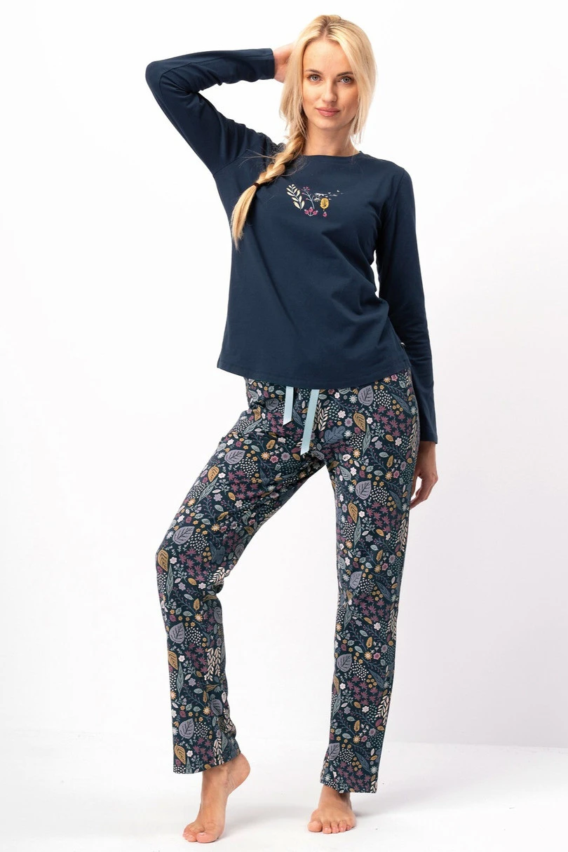Piżama damska LNS 570 B25 to połączenie wygody i modnego designu. Uszyta z wysokogatunkowej dzianiny (95% bawełna, 5% elastan), jest miękka, elastyczna i przyjazna dla skóry. Górę kompletu stanowi koszulka z długim rękawem, półokrągłym dekoltem i efektownym, kolorowym nadrukiem roślinnym z przodu. Spodnie z długą nogawką o prostym kroju, wzorzyste, wyposażone są w praktyczne kieszenie po bokach. W pasie zastosowano wygodną gumkę oraz wiązaną tasiemkę, co gwarantuje idealne dopasowanie i swobodę ruchów. To idealny wybór dla kobiet, które szukają piżamy łączącej codzienną funkcjonalność z modnym stylem.