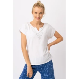 Damska piżama KEY LNS 623 to połączenie komfortu i uroku w codziennym wydaniu. Górna część kompletu to luźna, biała koszulka z krótkim rękawem i delikatnym, roślinnym nadrukiem w okolicach dekoltu, który dodaje subtelności i kobiecego charakteru. Bluzka ma praktyczne rozcięcie przy szyi, które dodaje stylu i zapewnia swobodę noszenia. Do kompletu dołączone są granatowe spodnie z drobnym, białym wzorem w kropki – klasyczne, ale zarazem urocze. Całość wykonana jest z miękkiej, oddychającej bawełny, dzięki czemu piżama doskonale sprawdzi się zarówno latem, jak i zimą. Idealna na relaksujące wieczory w domu czy spokojny sen.