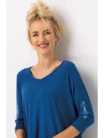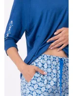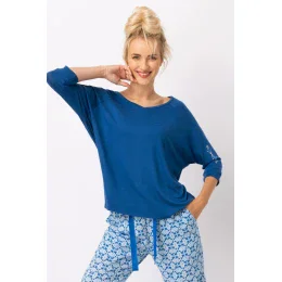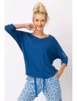 KEY LNS 721 to damska piżama, która łączy wygodę z nowoczesnym stylem. Bluzka w intensywnym odcieniu granatu ma luźny, oversize’owy krój z rękawem 3/4 i dekoltem w kształcie litery „V”. Delikatny nadruk na rękawie dodaje jej subtelnego charakteru. Spodnie z jasnoniebieskim, roślinnym printem pięknie kontrastują z górą i nadają piżamie lekkości. Elastyczny pas z wiązaniem zapewnia idealne dopasowanie i komfort noszenia przez całą noc. Wykonana z przyjemnej w dotyku, oddychającej tkaniny – doskonała zarówno na wieczory relaksu, jak i komfortowy sen.