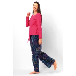 Ta piżama damska to idealne połączenie komfortu, funkcjonalności i energetycznego wyglądu. Górna część w intensywnym, różowym kolorze ma długi rękaw, subtelne zdobienia na mankietach i delikatny nadruk na przodzie, dodający całości uroku. Spodnie z miękkiej, przyjemnej w dotyku tkaniny w granatowej tonacji ozdobiono fantazyjnym, kolorowym wzorem przypominającym rozgwieżdżone niebo lub abstrakcyjne spirale. Luźny krój i elastyczny pas gwarantują pełną swobodę ruchów i wygodę podczas snu. To doskonały wybór dla kobiet, które chcą czuć się stylowo i komfortowo w domowych warunkach.