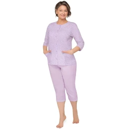 Blůza pyžama má 3/4 rukávy a je ozdobená květinovým vzorem. Půlkulatý výstřih se zapíná knoflíčky. Hladké kalhoty mají 3/4 délku. Střih a vzhled pyžama zachycují první tři fotografie.