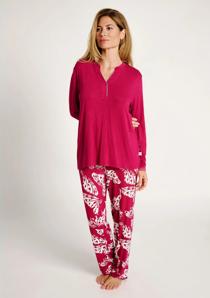 Dámské pyžamo Muydemi je elegantní a pohodlný komplet, který se postará o klidný spánek i příjemné domácí chvíle. Horní díl tvoří tričko s dlouhým rukávem v sytě růžové barvě se zapínáním na krátký zip u výstřihu. Kalhoty v dlouhém střihu zdobí moderní listový vzor v kontrastní kombinaci růžové a bílé barvy. Pyžamo je vyrobeno z měkkého a příjemného materiálu, který zajistí komfort během celé noci. Stylový design dodává pyžamu šmrnc, díky čemuž je ideální nejen na spaní, ale i na pohodové večery doma.
