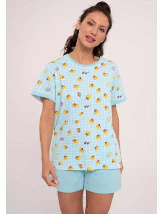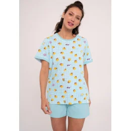 Dámské pyžamo od značky Muydemi. Vrchní díl pyžama má krátký rukáv, kulatý výstřih a veselý potisk. Šortky jsou jednobarevné, po stranách mají kapsy a v pase mají šňůrku na stáhnutí. Pyžamo je ušité z lehkého příjemného materiálu.
