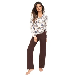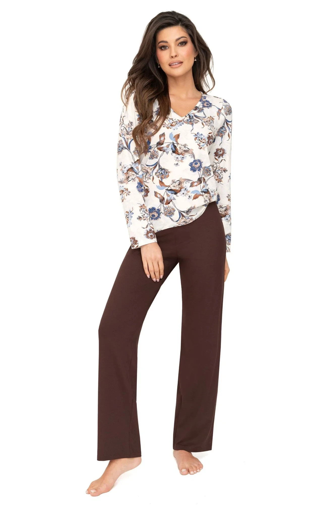 Dámské pyžamo Naomi long Donna - z vysoce jakostní viskózy - krémové tričko s dlouhými rukávy - výstřih ve tvaru V - s květinovým vzorem - dlouhé hnědé kalhoty
