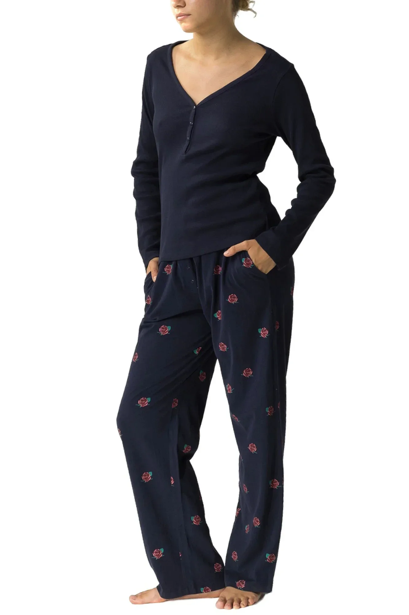 Dámské pyžamo NLP 482 dark blue Atlantic - tmavě modrá barva - hladká halenka s dlouhým rukávem a širokým výstřihem - ozdobné knoflíky z žebrovaného úpletu - dlouhé kalhoty s volnými nohavicemi a kapsami - široká šňůrka v pase