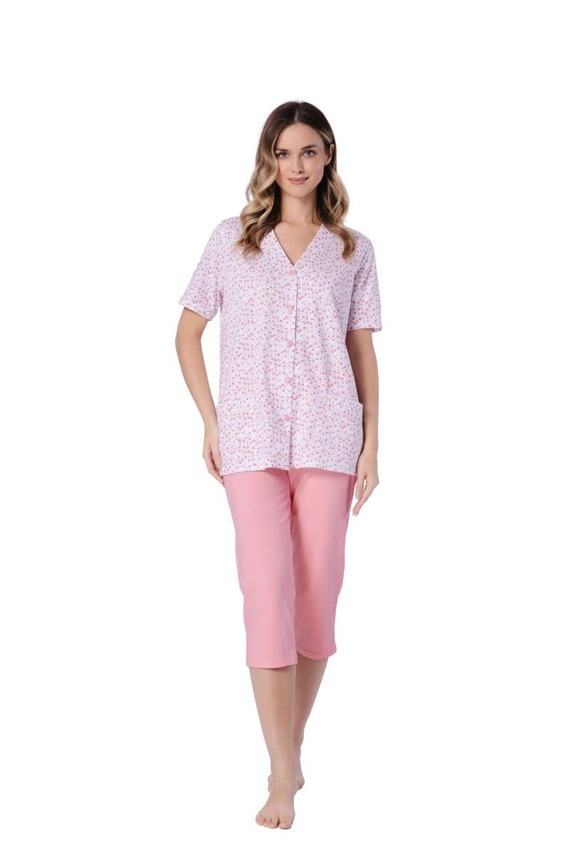 Dámské pyžamo na knoflíky Odetta 1722 značky Leveza je pohodlnou a funkční volbou pro jarně-letní sezónu. Je vyrobeno ze 100% přírodní bavlny, je měkké, prodyšné a jemné k pokožce, což zaručuje pohodlný spánek a domácí relaxaci. Blůza na knoflíky s výstřihem do V a krátkými rukávy má praktickou kapsu, zatímco drobný květinový vzor v bílé a korálové barvě dodává celku lehkost a svěžest. 3/4 dlouhé kalhoty s rybím copem v jednobarevné korálové barvě zaručují volnost pohybu a pohodlné nošení. Jedná se o ideální pyžamo pro ženy, které oceňují pohodlí, klasický střih a praktické detaily.