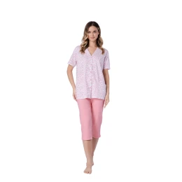 Dámské pyžamo na knoflíky Odetta 1722 BIG značky Leveza je pohodlnou a funkční volbou pro jarně-letní sezónu. Je vyrobeno ze 100% přírodní bavlny, je měkké, prodyšné a jemné k pokožce, což zaručuje pohodlný spánek a domácí relaxaci. Blůza na knoflíky s výstřihem do V a krátkými rukávy má praktickou kapsu, zatímco drobný květinový vzor v bílé a korálové barvě dodává celku lehkost a svěžest. 3/4 dlouhé kalhoty s rybím copem v jednobarevné korálové barvě zajišťují volnost pohybu a pohodlné nošení. Jedná se o ideální pyžamo pro ženy, které ocení pohodlí, klasický střih a praktické detaily.