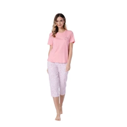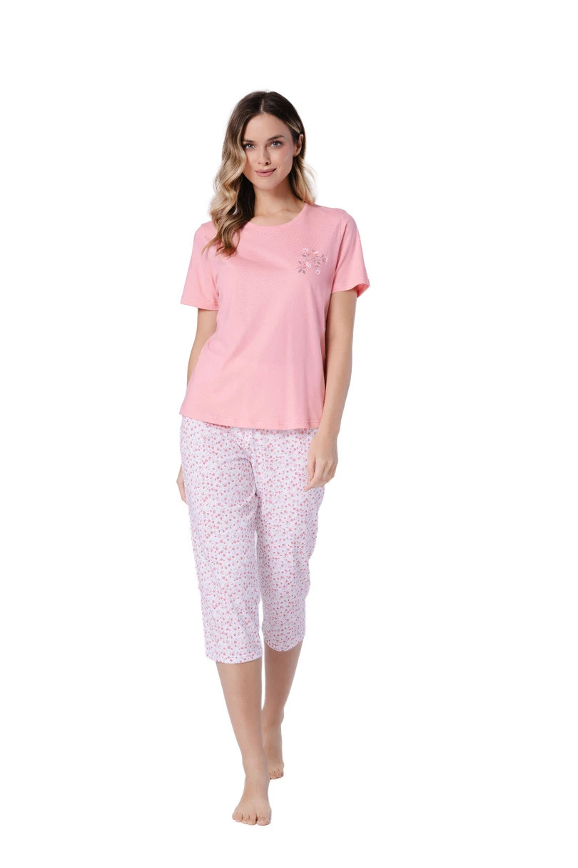 Kalhoty ve 3/4 délce byly navrženy pro maximální pohodlí. Bílé a korálové barevné provedení a jemný květinový vzor dodávají pyžamu lehkost a jemnou eleganci. Model nemá kapsy, díky čemuž dokonale přiléhá k tělu a neomezuje v pohybu.