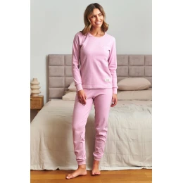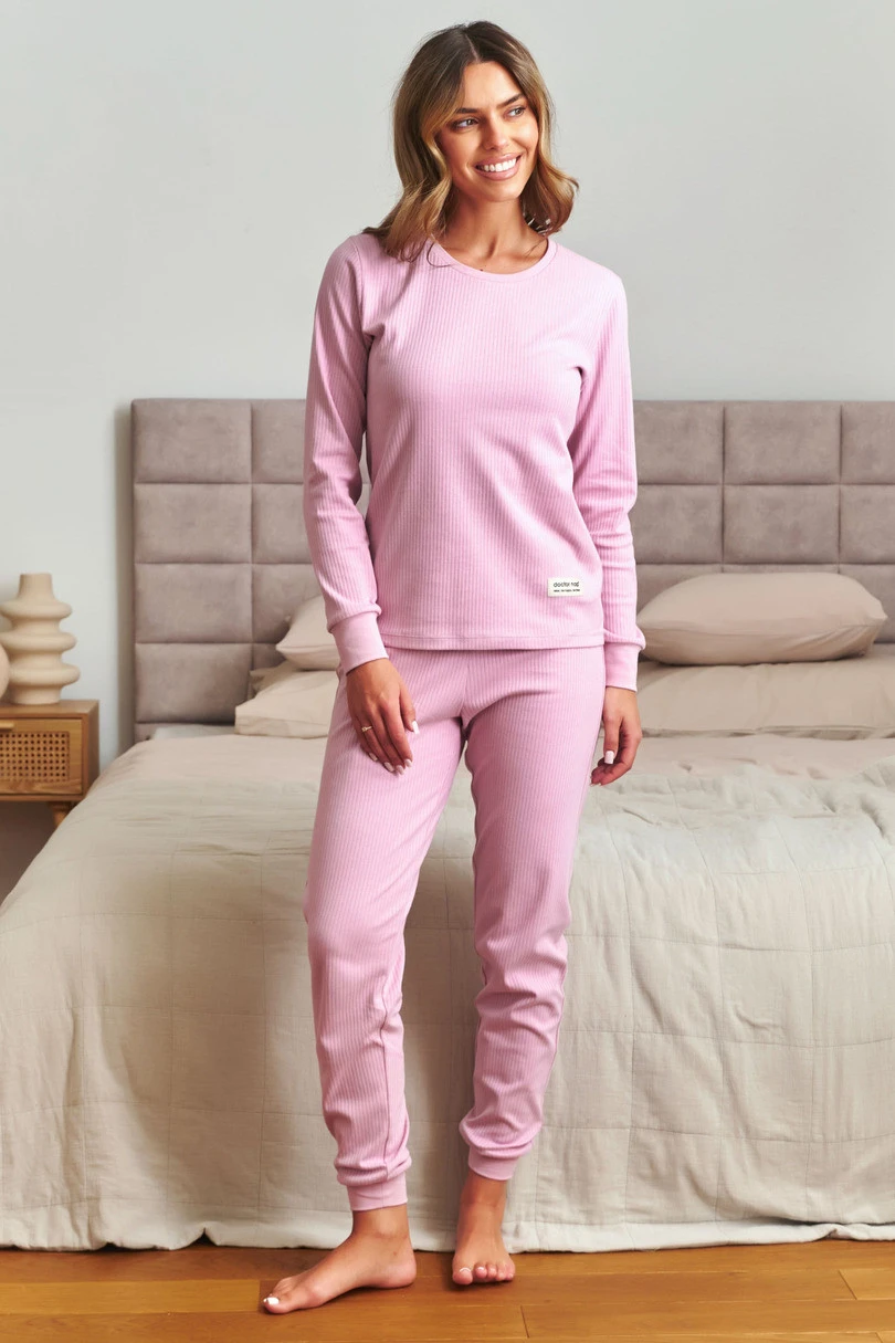 Zarówno bluzka z długim rękawem, jak i długie spodnie zostały zakończone ściągaczami, co zwiększa komfort termiczny i zapobiega przesuwaniu się materiału w trakcie snu. Minimalistyczny, dopracowany krój nadaje piżamie nowoczesny charakter, a dostępność w wersji