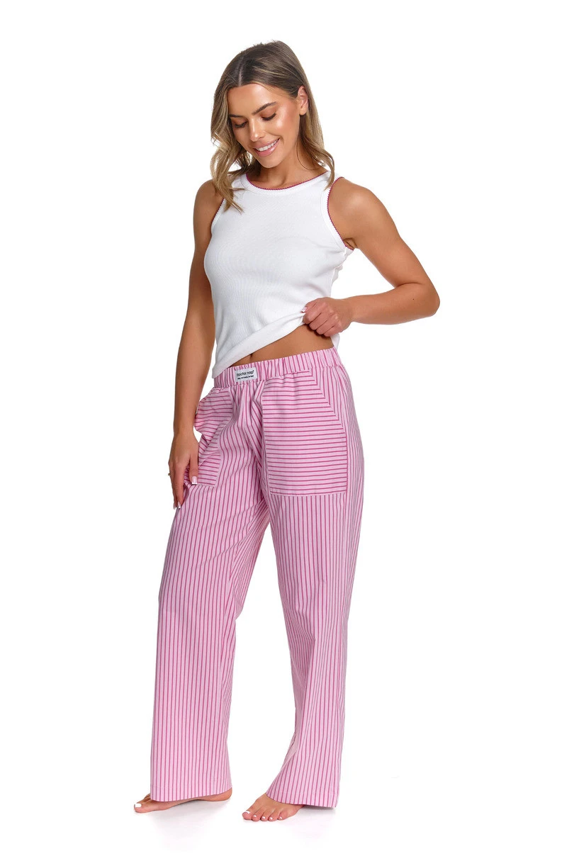 Dlouhé kalhoty z látky s nadčasovými pruhy mají jednoduchý, ležérní střih, který zaručuje pohodlí při spánku i odpočinku. Pružný pas zajišťuje dokonalé přizpůsobení a praktické kapsy zvyšují funkčnost soupravy. Materiál kalhot (71 % bavlna, 26 % polyester, 3 % elastan) je odolný a příjemný na dotek.