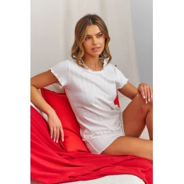 Pyžamo je vyrobeno z jemné žebrované bavlny, která celku dodává jemný půvab a jedinečnou estetiku. Košilka a šortky jsou lemovány jemným lemem, který podtrhuje ženský charakter soupravy a dodává jí lehkost. Volný střih zaručuje plné pohodlí a snadné nošení bez omezení pohybu.