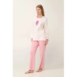 Užijte si příjemné zimní noci s tímto dámským pyžamem ze 100% bavlněného interlocku. Souprava obsahuje hladké kalhoty a puntíkovaný top s roztomilým potiskem a klasickým kulatým výstřihem. Je navrženo ve střihu regular fit, který nabízí pohodlí a lichotivou siluetu. Tato pyžamová souprava, která je ideální pro domácí odpočinek nebo kvalitní spánek, v sobě spojuje styl a pohodlí.