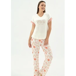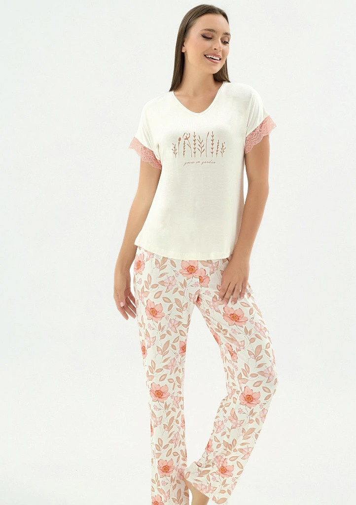 Dámské pyžamo s krátkým rukávem spojuje pohodlí s jemnými ženskými detaily. Tričko je doplněno rukávy zakončenými krajkou, která dodává celému modelu elegantní a romantický vzhled. Přední stranu zdobí stylová aplikace, jež podtrhuje celkový design. Dlouhé kalhoty mají pohodlný střih a pas do gumy, díky kterému se skvěle přizpůsobí postavě a zajistí maximální komfort při nošení i spánku. Příjemný materiál a promyšlené provedení dělají z tohoto pyžama ideální volbu pro každodenní odpočinek.