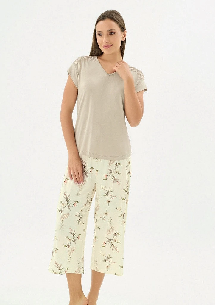 Dámské viskózové pyžamo je ideální volbou pro pohodlný spánek i domácí relaxaci. Příjemný a prodyšný materiál z viskózy je jemný na dotek a zajišťuje maximální komfort po celou noc. Horní díl tvoří tričko s krátkým rukávem, který je zakončen výraznějším lemem. Ramena zdobí jemná krajka, která dodává celému modelu ženský a elegantní vzhled. Kalhoty v praktické 7/8 délce mají pohodlný střih a pružný pas do gumy, díky čemuž se skvěle přizpůsobí postavě a neomezují v pohybu. Stylové a zároveň pohodlné pyžamo, které si zamilujete pro každodenní nošení.
