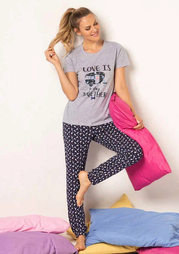 Dámské pyžamo značky Siélei v pohodlném a hravém provedení je ideální volbou pro klidný spánek i relaxaci doma. Horní díl tvoří šedé tričko s krátkým rukávem a kulatým výstřihem, které zdobí potisk s nápisem „Love is to stay together“ a romantickým motivem. Spodní díl tvoří dlouhé tmavě modré nebo růžové kalhoty s jemným celoplošným vzorem, které mají pohodlný střih a příjemně se nosí. Měkký a lehký materiál je velmi příjemný na dotek a zajišťuje maximální komfort během celé noci. Toto pyžamo je skvělou volbou pro ženy, které hledají kombinaci pohodlí, stylu a kvalitního zpracování značky Siélei.