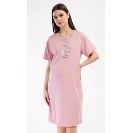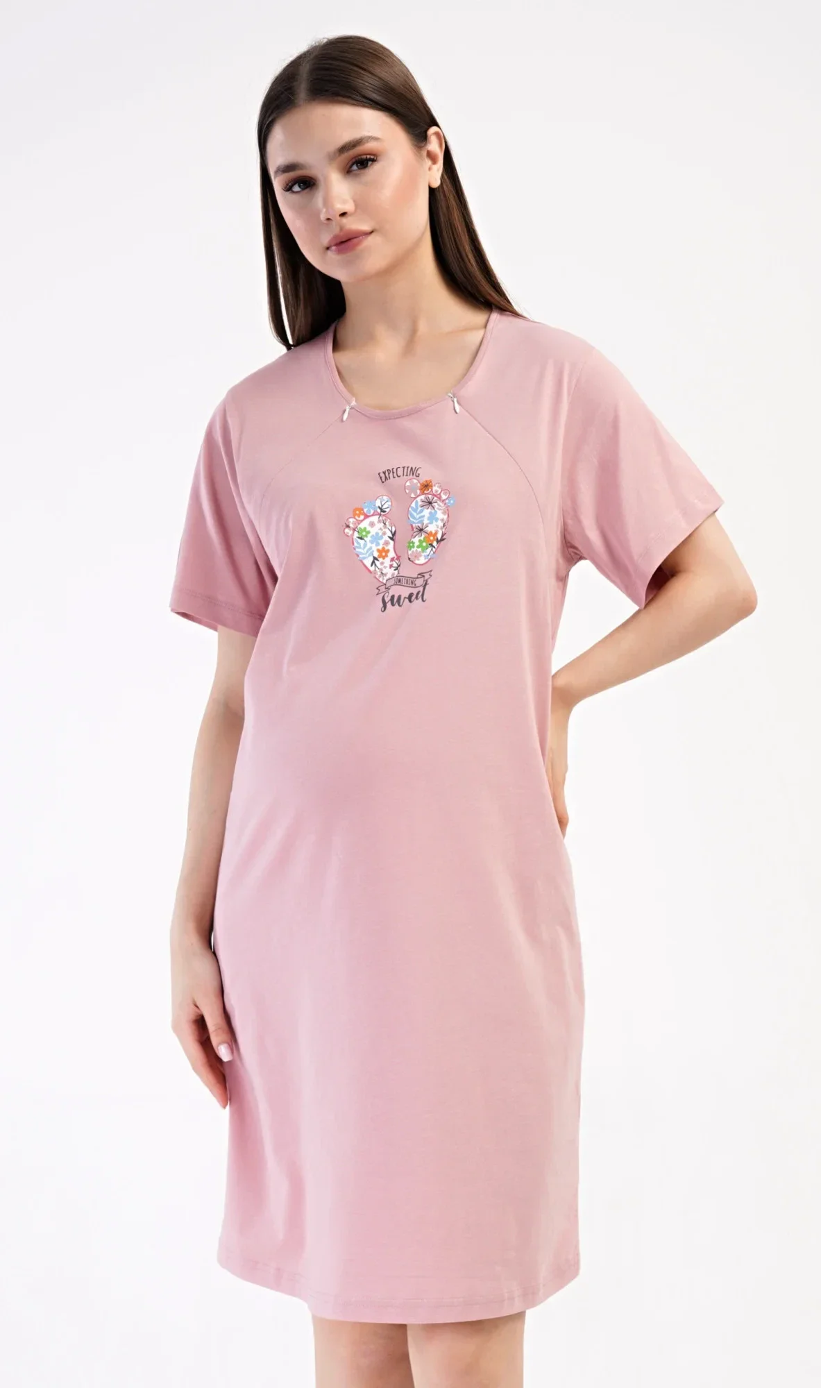 Dámská bavlněná mateřská noční košile Sweet. Noční košile je svým střihem určená na dobu těhotenství, do porodnice i ke kojení. Ke kojení slouží průstřihy po stranách košile, které jsou uzavíratelné na zip. Přední díl košile zdobí obrázek dětských nožiček. Použitý materiál s podílem bavlny 100% je příjemný a poddajný na dotek.