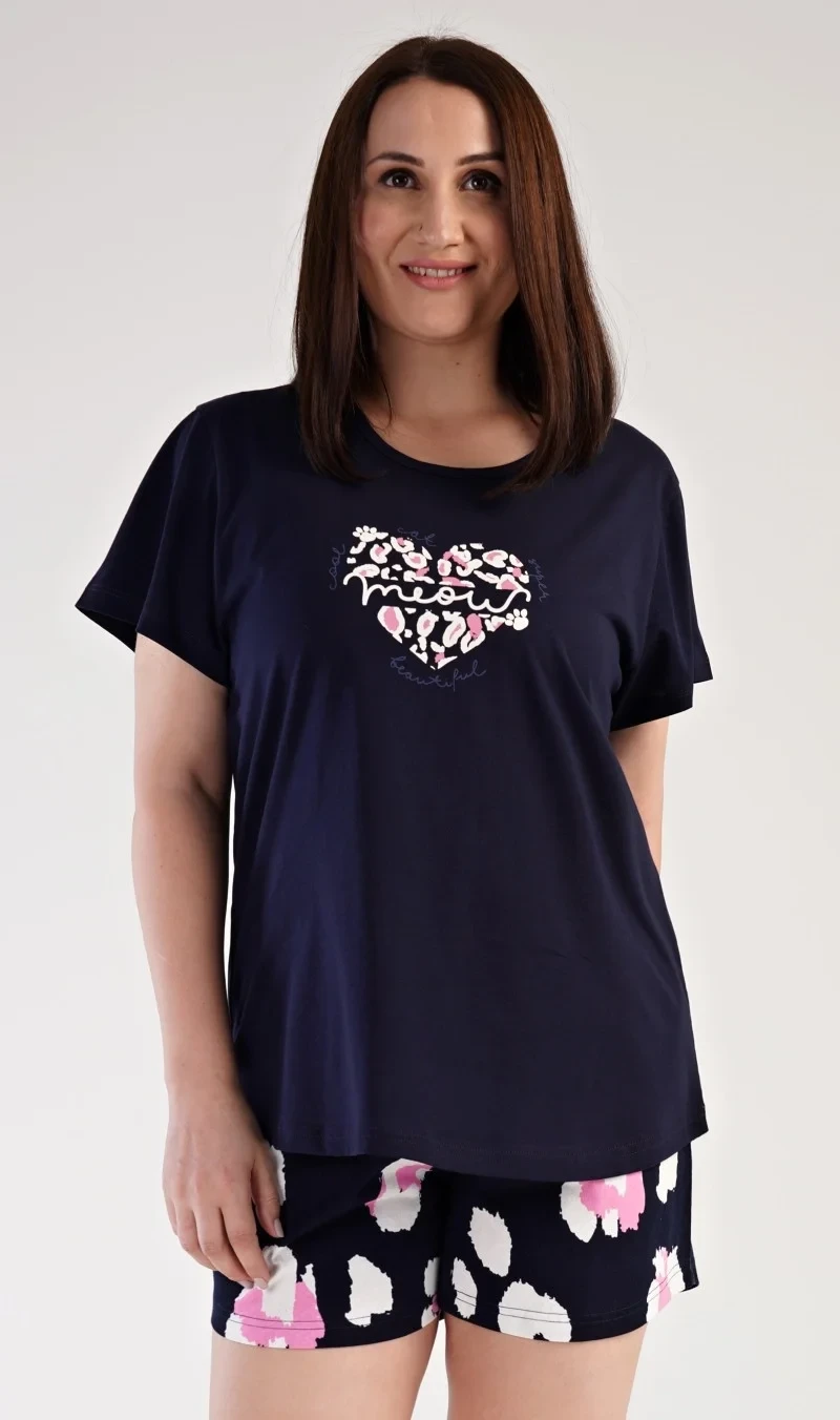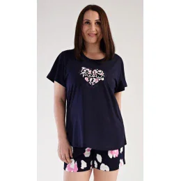 Dámské bavlněné pyžamo šortky Jana. Dámské pyžamo se skládá z trička s krátkým rukávem a šortkových kalhot. Na jednobarevném tričku je decentní obrázek ve tvaru srdce. Šortky mají v pase gumu a šňůrku na stáhnutí, jsou bez kapes. Použitý bavlněný materiál je příjemný a poddajný na dotek.
