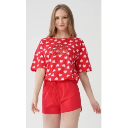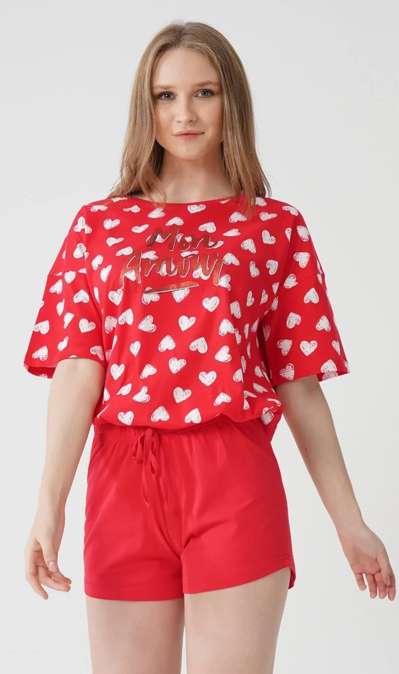 Dámské bavlněné pyžamo šortky Mon amour. Dámské pyžamo šortky se skládá z trička s krátkým rukávem a krátkých šortkových kalhot. Červené tričko je potištěno bílými srdíčky, zdobí ho nápis MON AMOUR. Výrazné tričko vhodně doplňují jednobarevné červené šortky s gumou a šňůrkou ke stažení v pase. Použitý bavlněný materiál je příjemný a poddajný na dotek.