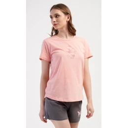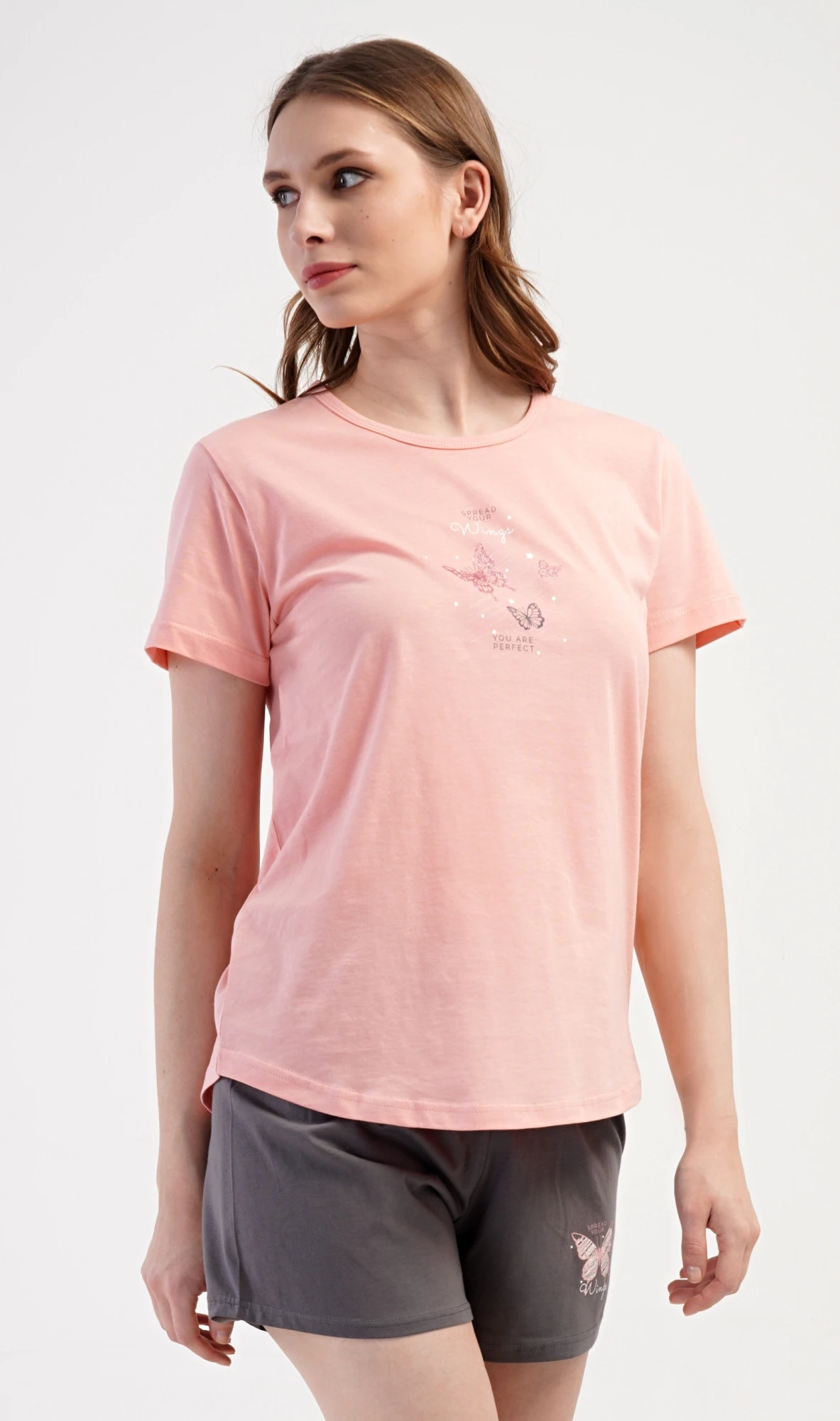 Dámské bavlněné šortkové pyžamo Motýlci. Dámské pyžamo se skládá z trička s krátkým rukávem a šortkových kalhot. Jednobarevné tričko zdobí obrázek motýlků. Stejný motiv se opakuje i na šortkách, které mají v pase gumu a šňůrku na stáhnutí, jsou bez kapes. Použitý bavlněný materiál je příjemný a poddajný na dotek.