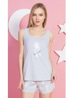 Dámské bavlněné pyžamo šortky na ramínka Medvídek. Dámské pyžamo se skládá z tílka se širšími ramínky a krátkých šortkových kalhot. Na tričku je velká hlavička medvídka s nápisem Little one. Stejný motiv se opakuje i na šortkách. Materiál tílka je 100% bavlna šortky mají složení 70% bavlny a 30% polyester. Použitý materiál je příjemný a poddajný na dotek.