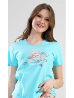 Dámské bavlněné pyžamo šortky Nice day. Dámské pyžamo se skládá z trička s krátkým rukávem a krátkých šortkových kalhot. Na tričku je obrázek roztomilé spící sovičky na větvi a nápis Have a nice day. Motiv soviček se opakuje i na krátkých šortkových kalhotách. Použitý bavlněný materiál je příjemný a poddajný na dotek.