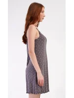 Dámská noční košile na ramínka Samanta. Dámská noční košile s úzkými ramínky má příjemnou délku nad kolena a ozdobné žlábkování okolo spodního lemu. Ramínka jdou nastavit na Vám pohodlnou délku. Výstřih je ozvláštněn jemnou krajkou. Košile je potištěna hvězdičkami ve světle lososové barvě. Použitý materiál ze směsi viskózy a lycry je příjemný a poddajný na dotek.