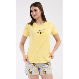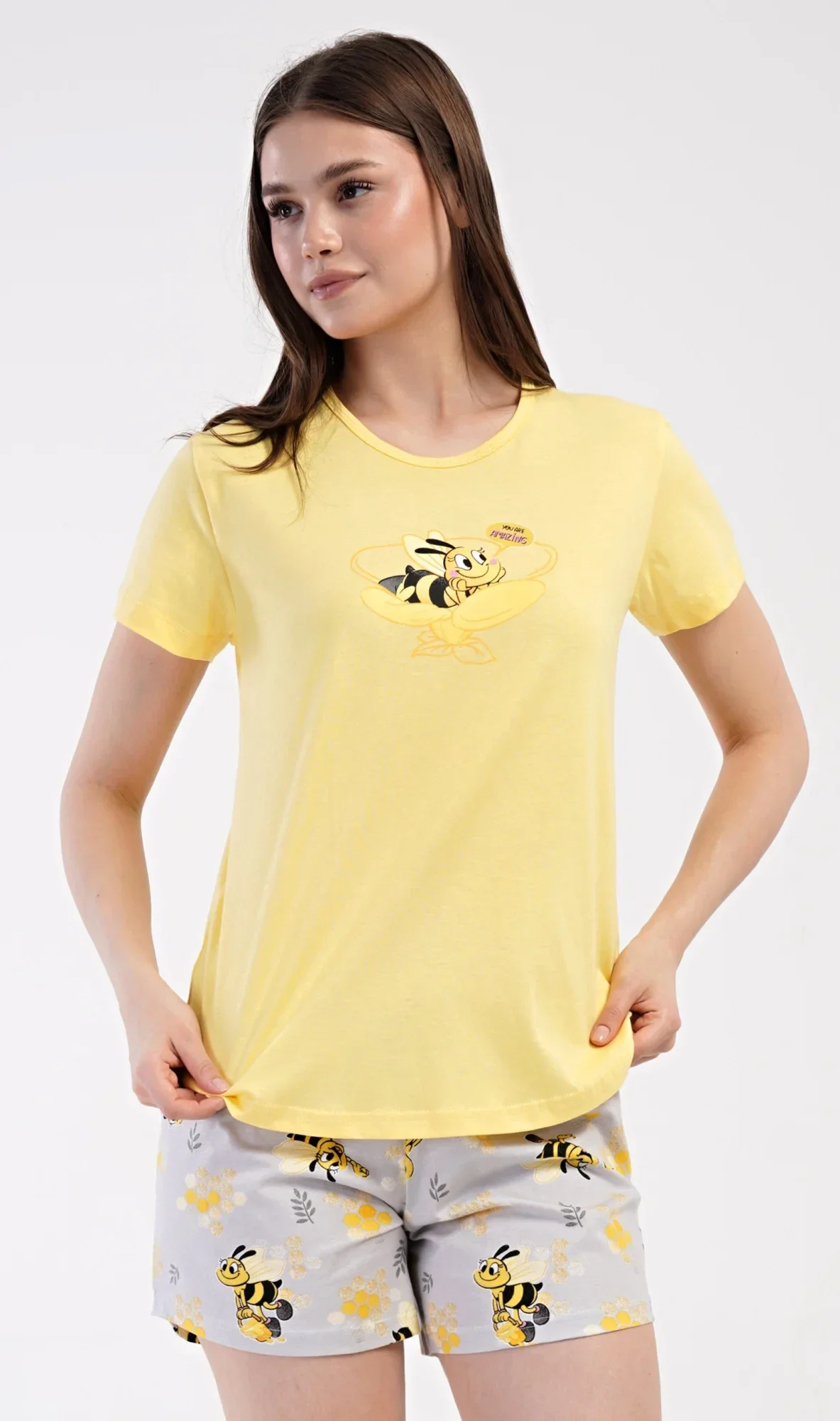 Dámské bavlněné šortkové pyžamo Včelka. Dámské pyžamo se skládá z trička s krátkým rukávem a šortkových kalhot. Jednobarevné tričko zdobí obrázek včelky. Stejný motiv se opakuje i na šortkách, které mají v pase gumu a šňůrku na stáhnutí, jsou bez kapes. Použitý bavlněný materiál je příjemný a poddajný na dotek.