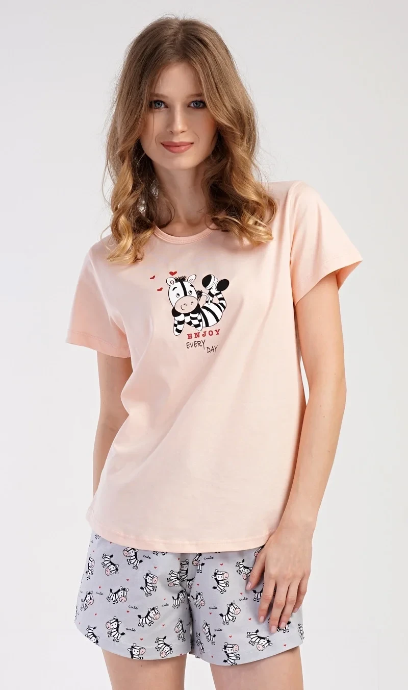 Dámské šortkové pyžamo Zebra. Dámské pyžamo se skládá z trička s krátkým rukávem a šortkových kalhot. Na jednobarevném tričku je obrázek veselé zebry a nápis 'Enjoy every day'. Potisk malých zeber se opakuje i na šortkách, které mají v pase gumu a šňůrku na stáhnutí, jsou bez kapes. Použitý materiál je příjemný a poddajný na dotek. Šortky mají podíl bavlny 100%, tričko v lososové barvě 100% a v šedé 70% bavlny.