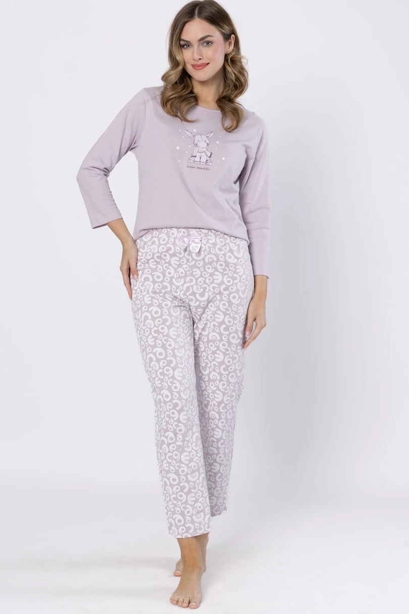 Piżama damska ZOFIA 1614 od marki Leveza to urocza i komfortowa propozycja dla kobiet, które cenią sobie wygodę z odrobiną humoru. Wykonana w 100% z miękkiej, naturalnej bawełny, zapewnia komfort i swobodę ruchów przez całą noc. Bluzka z okrągłym dekoltem i rękawem 7/8 utrzymana jest w delikatnym liliowym kolorze i ozdobiona nadrukiem z wesołym osiołkiem, co nadaje całości lekkości i pozytywnego charakteru. Spodnie 7/8 w tym samym odcieniu zdobi nieregularny wzór literek oraz dekoracyjna kokardka w pasie. Model dostępny w rozmiarach S–2XL – idealny na każdą porę roku.