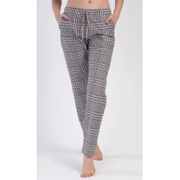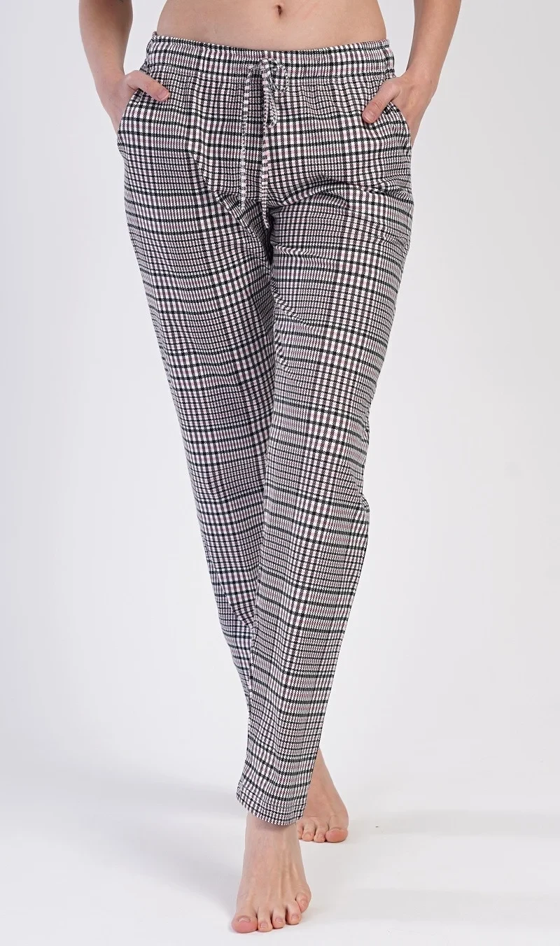Dámské bavlněné pyžamové kalhoty Carmen. Dámské pyžamové dlouhé kalhoty s károvaným vzorem mají v pase gumu a šňůrku ke stažení. Kalhoty mají praktické kapsy a jsou vhodné i na denní nošení. Použitý bavlněný materiál je příjemný a poddajný na dotek.